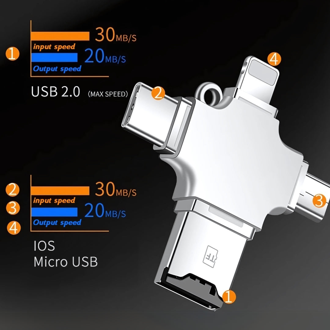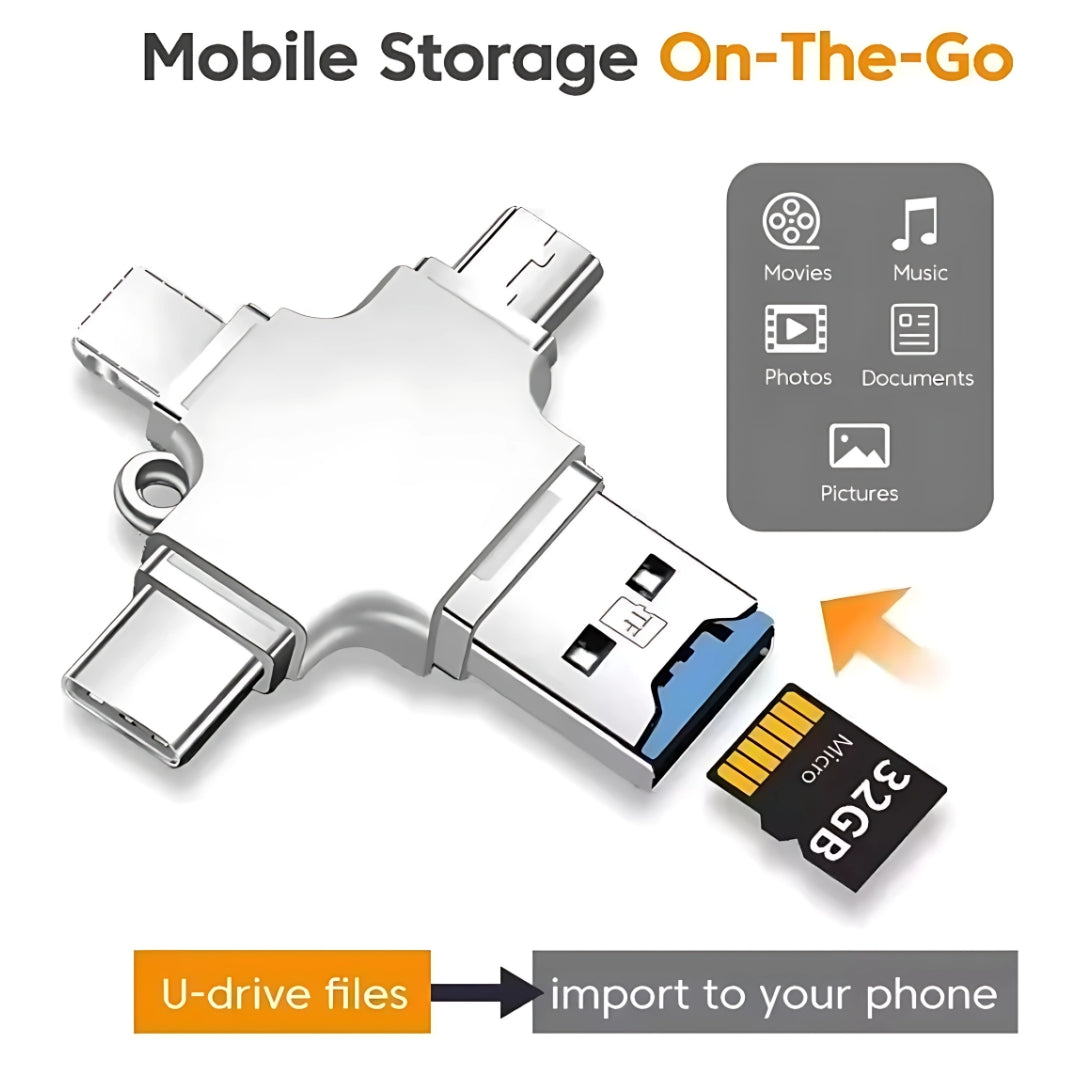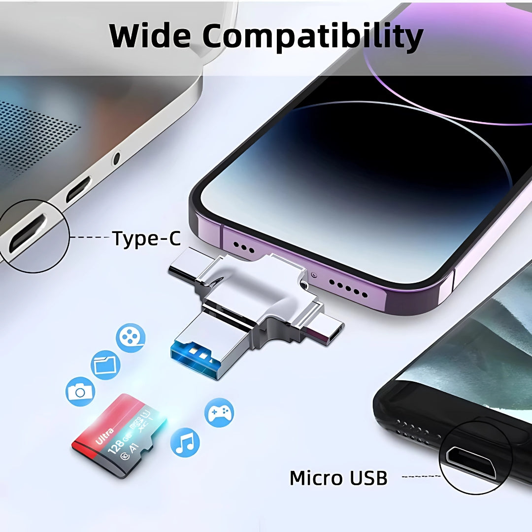 The 4-in-1 Card Reader is more than just a card reader; it’s an all-in-one data management tool designed to cater to modern connectivity needs. Whether you’re transferring high-resolution images from a DSLR, managing files on your smartphone, or expanding your device's storage, the 4-in-1 ensures efficiency, reliability, and speed.