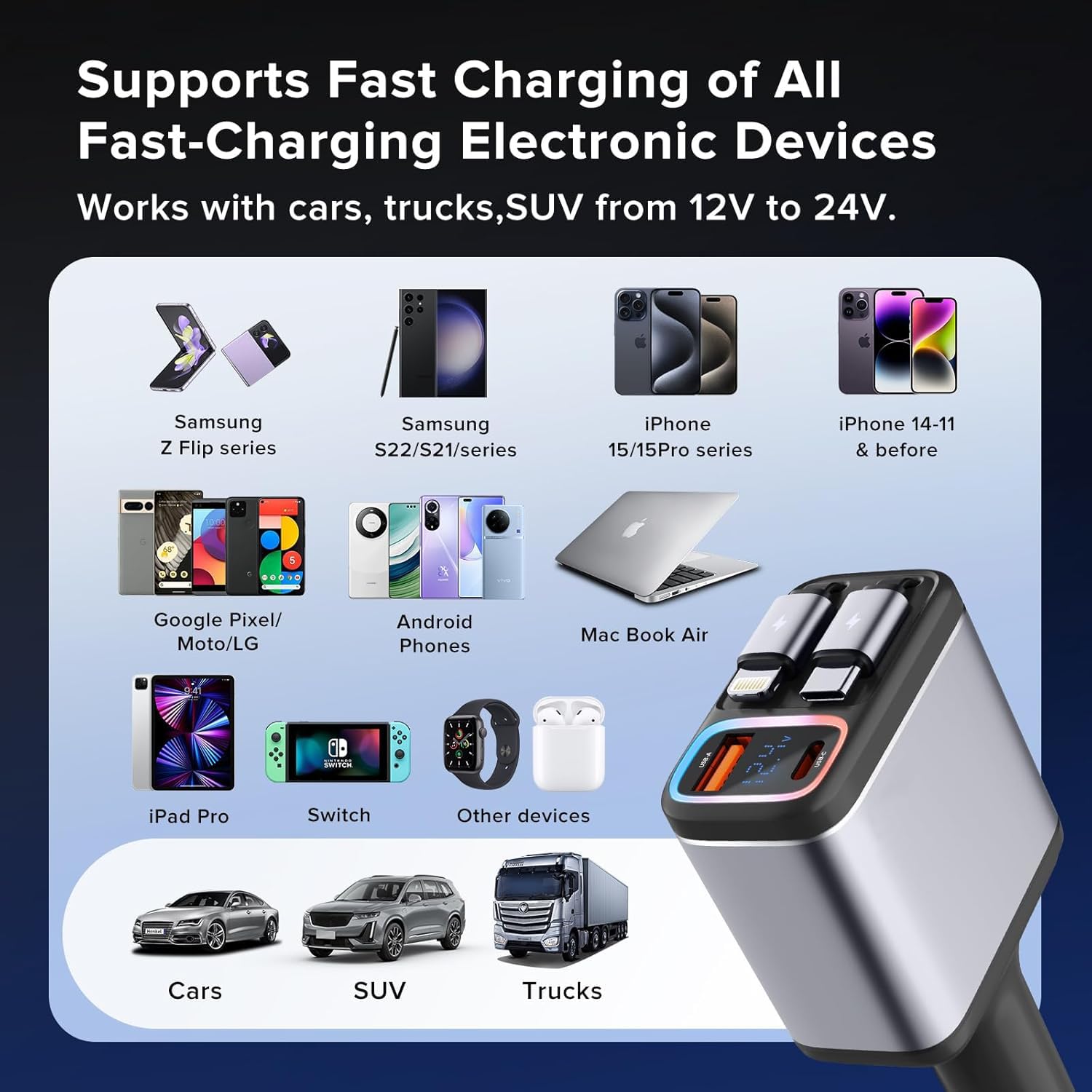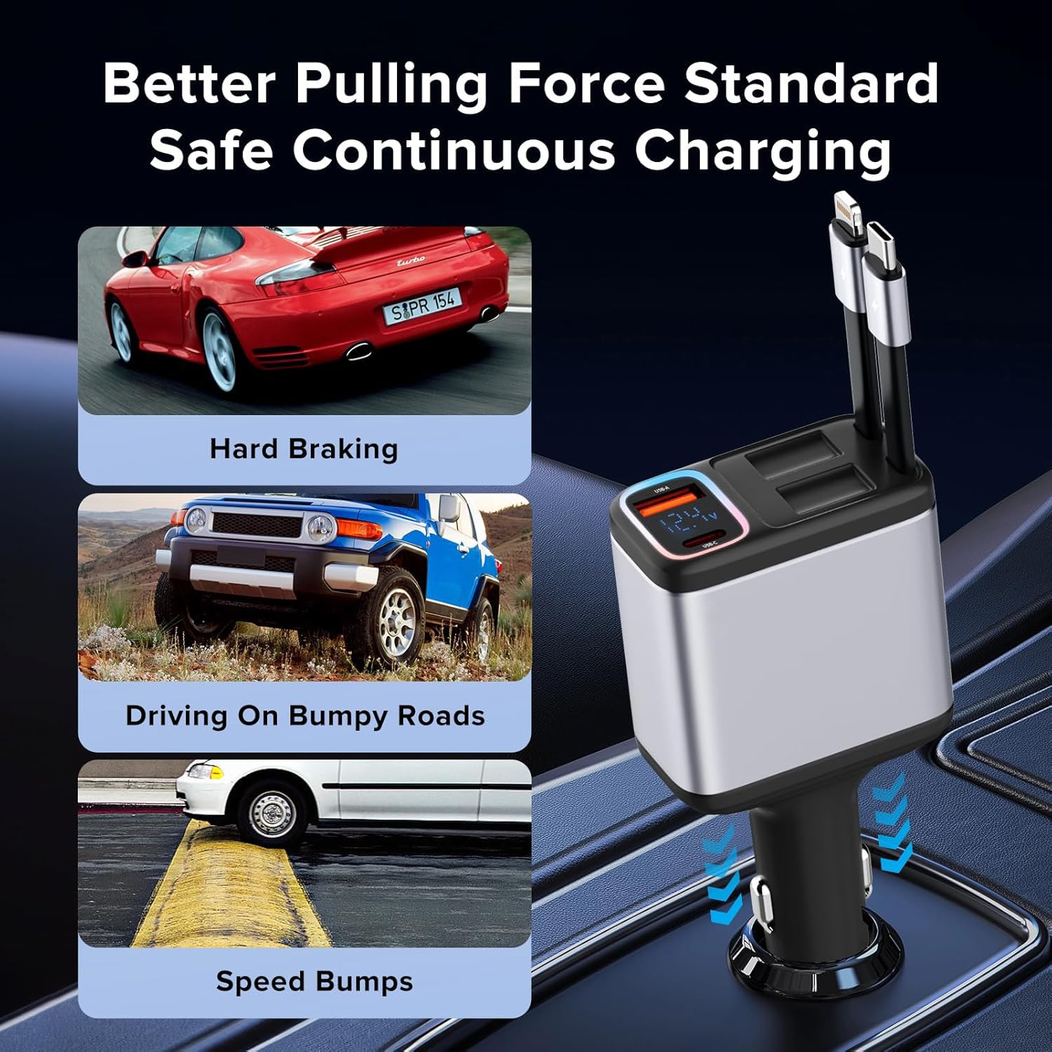 bAssDrops 117 Watt Retractable Car Charger, Retractable Cables (31.5 inch) and 2 USB Ports Car Charger Adapter for iPhone 16/15/14/13/12 Pro Max, Samsung, Pixel