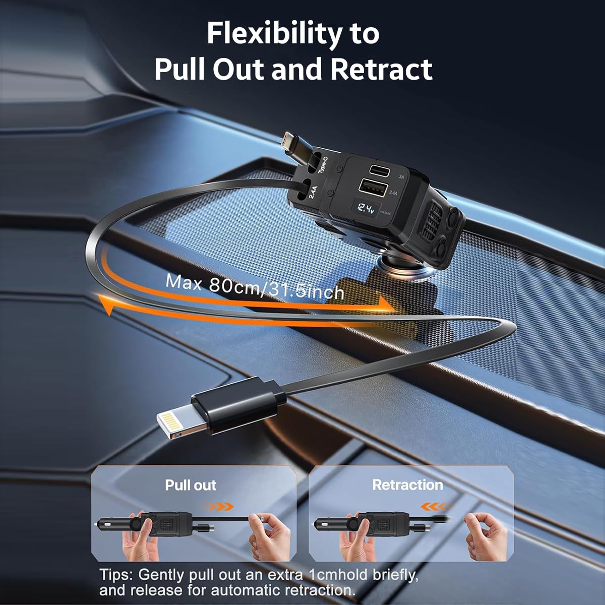 The 66W Retractable Car Charger is a powerful, all-in-one charging solution for on-the-go convenience. With built-in retractable USB-C and Lightning cables and dual USB ports (USB-C PD & USB-A), this charger allows you to charge multiple devices simultaneously at high speeds. Its compact, tangle-free design makes it an essential accessory for any vehicle.