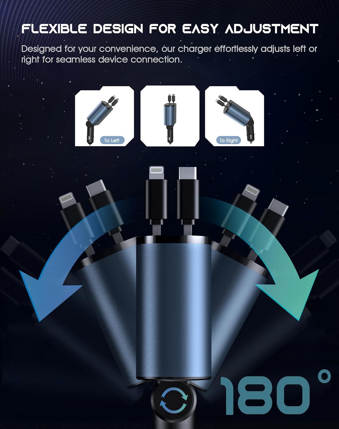 Retractable Car Charger, 120 W, 4 in 1 Super Fast Charge (31.5 inch) with 2 USB Ports for iPhone 15 / 14 / 13 / 12 Pro Max XR, iPad, Samsung, Pixel